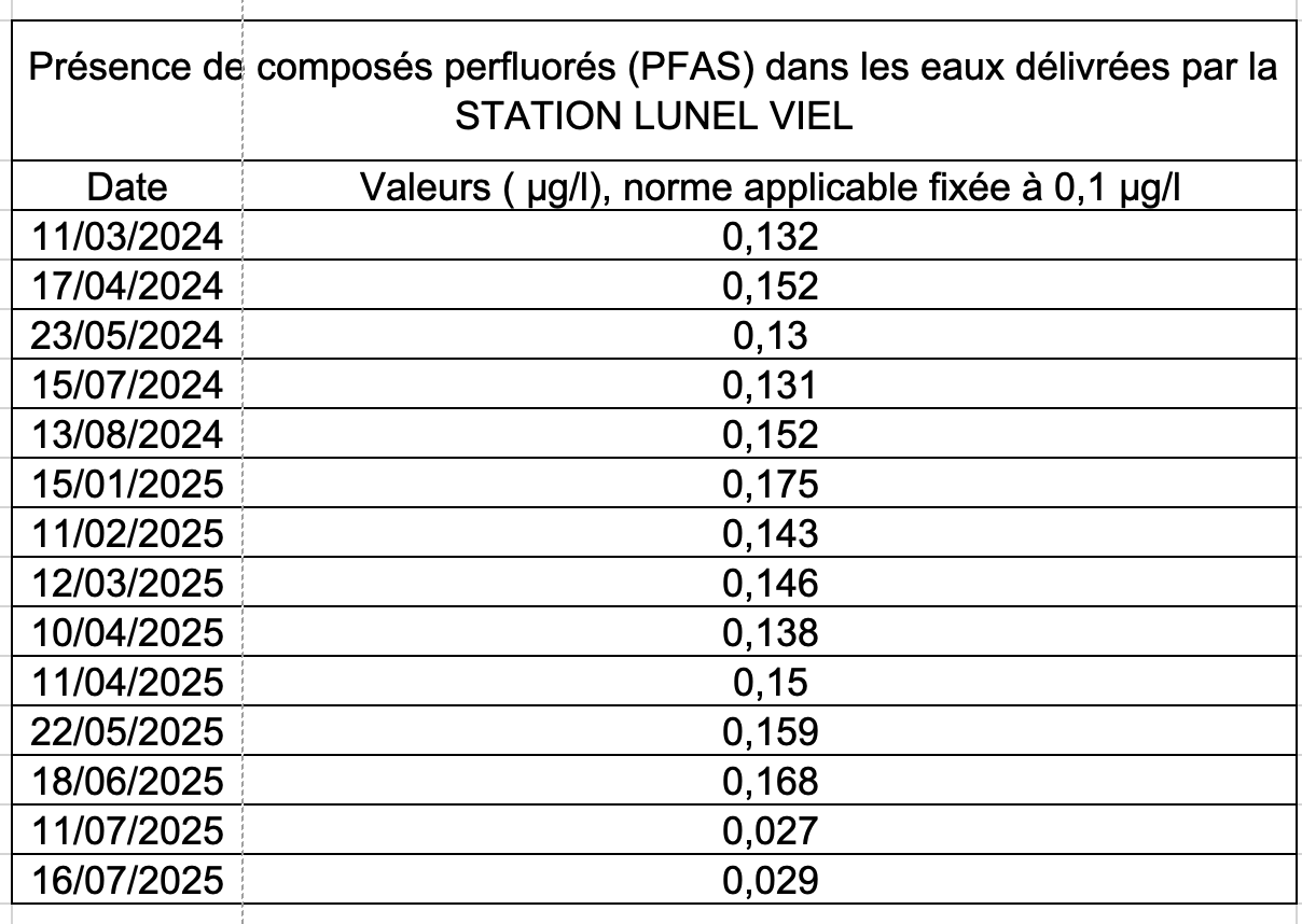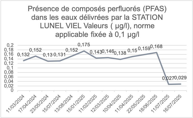 Une analyse de type PFAS a été réalisée le 16 juillet 2025 en départ distribution de la station de Lunel-Viel.